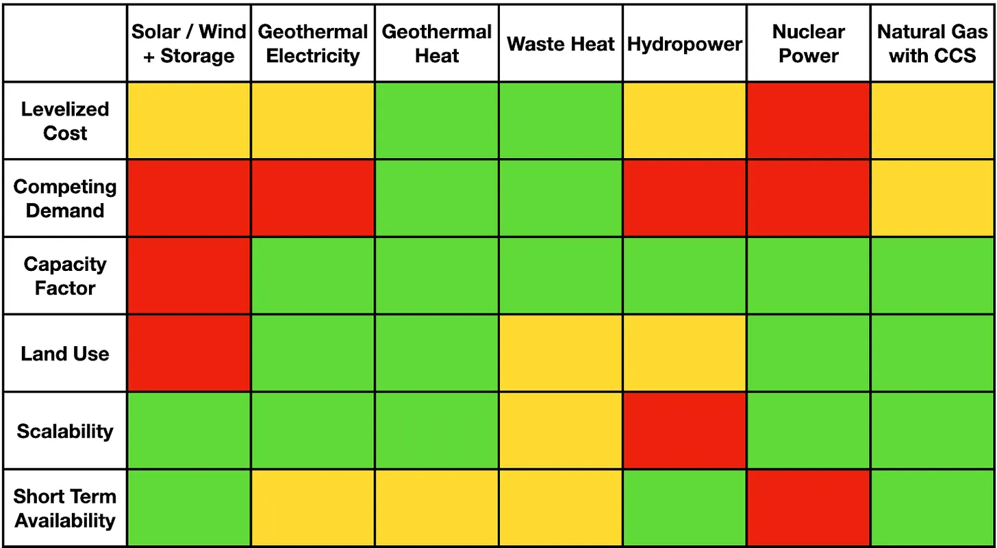 Geothermal Energy: Geothermal energy is a firm, clean, reliable, and abundant resource with a relatively low land footprint. While high exploration costs have limited geothermal power deployments in the past, the application of techniques from the oil and gas industry to geothermal exploration and drilling is rapidly improving its cost profile. Geothermal energy is underutilized relative to its global abundance; this is especially true for low-temperature and moderate-temperature geothermal resources which are widespread but almost totally unused due to their poor electrical conversion efficiencies. Critically, using geothermal heat as a direct input for thermal DAC processes could bypass the poor heat-to-electricity conversion efficiencies typically seen in geothermal power production, opening an opportunity to run DAC using geothermal resources which are otherwise uneconomical for power generation but well-suited for DAC processes. In fact, using geothermal heat for its thermal value appears to offer the lowest energy cost of any firm renewable source — a topic for another post.